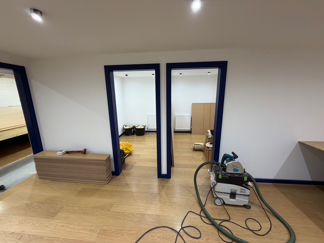 The fresh plaster has been painted white and trimmed with navy skirtings and architraves, colour-matched to our logo.